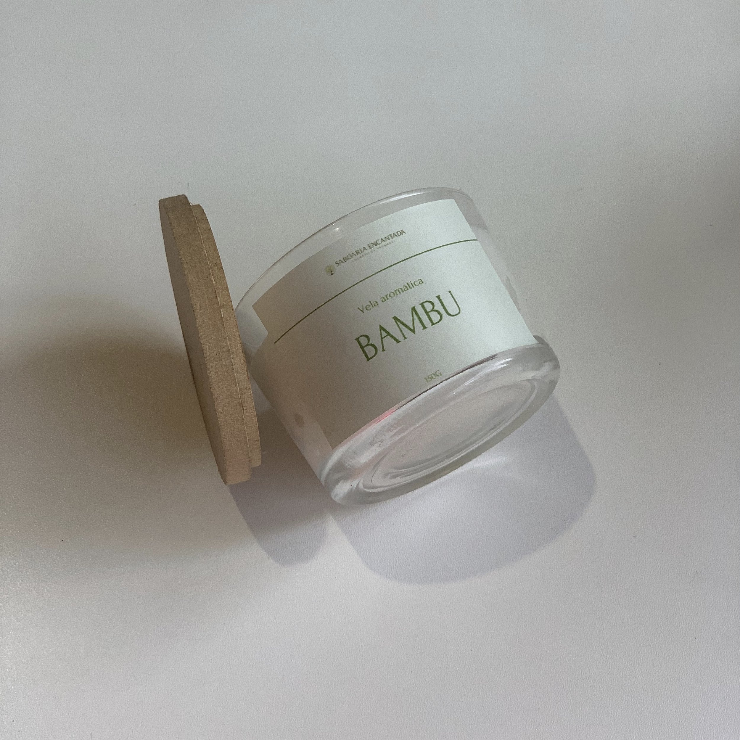 Nossa vela aromática possui 150g, com aroma de bambu, produzida manualmente com cera de coco. Vegana.