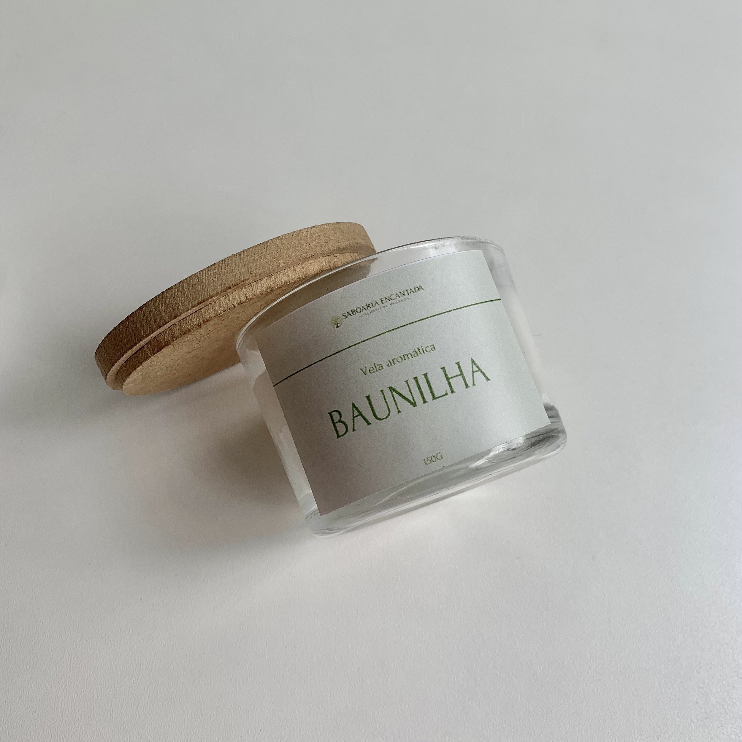 Nossa vela aromática possui 150g, com aroma de baunilha, produzida manualmente com cera de coco. Vegana.